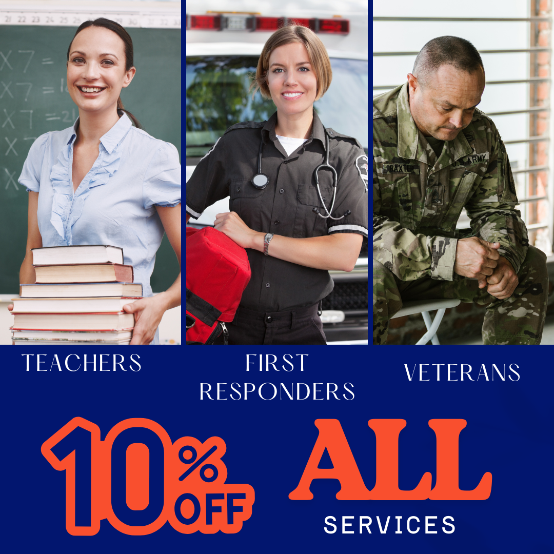 Community Heroes Discount: Teachers, First Responders, and Veterans receive 10% off our services in recognition of all you do for others.